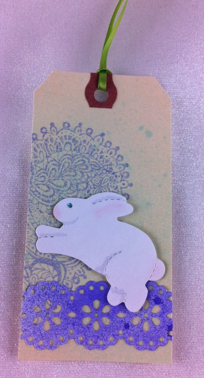 I have seven Easter Baskets to fill this year so I made these quick and easy tags for them. The manilla tags are from an office supply store and are misted with Radiant Rain Shimmer Mist in Sea Foam. Then I stamped an Inkadinkadoo stamp with Stampin Up's Almost Amethyst ink over the misting. Martha Stewarts eyelet punch is pale blue and is brightened up with Tattered Angels Lavender Fields. Finally a Sizzix bunny is die cut and colored with pink chalk on the ears, nose and tail and a grey Tombow marker highlights the would be shaded areas. Pop dots raise the bunny up just a tad for dimension. Waterfall Stickles make up the blue eyes.